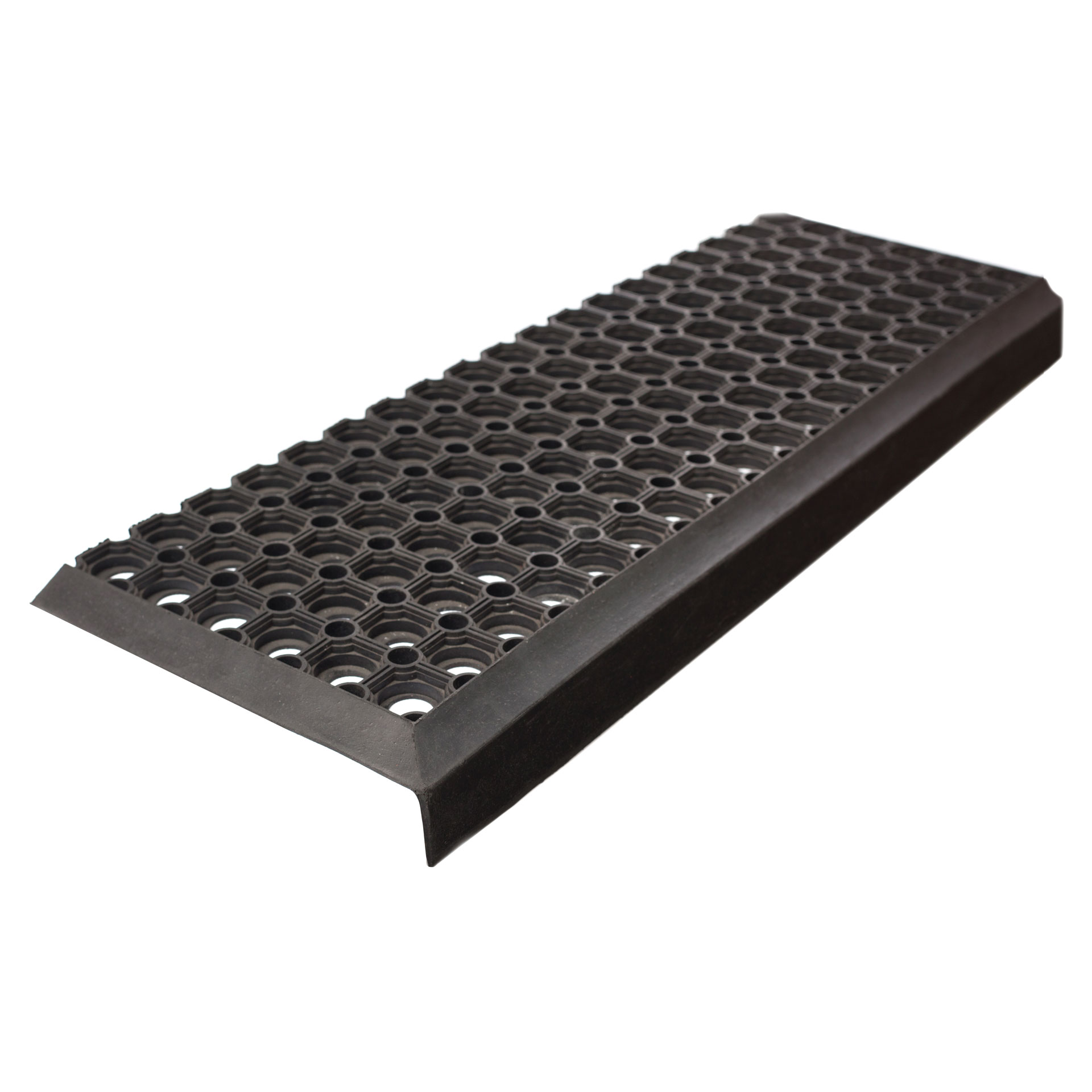 Проступь с отверстиями представляет собой резиновую антискользящую накладку на ступень Г-образной формы, которое при монтаже практически целиком покрывает ступень, создавая эффект полного покрытия лестницы (резиновые ступени). Рекомендуется для установки в местах с большой проходимостью. Конструктивно накладная проступь состоит из двух плоскостей. Рабочая и нерабочая поверхности проступи расположены под углом 90 градусов друг к другу, имеют различные геометрические размеры и фактуру. Выполняется из цельной резины